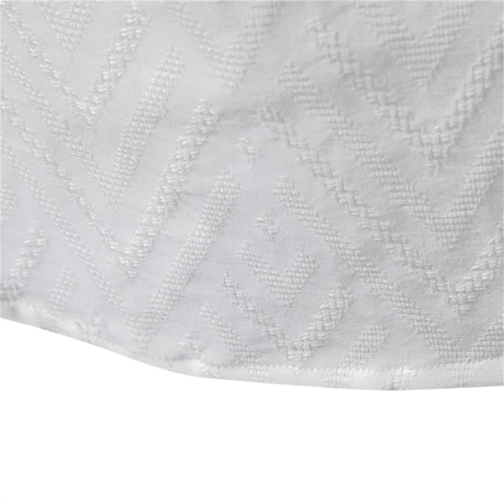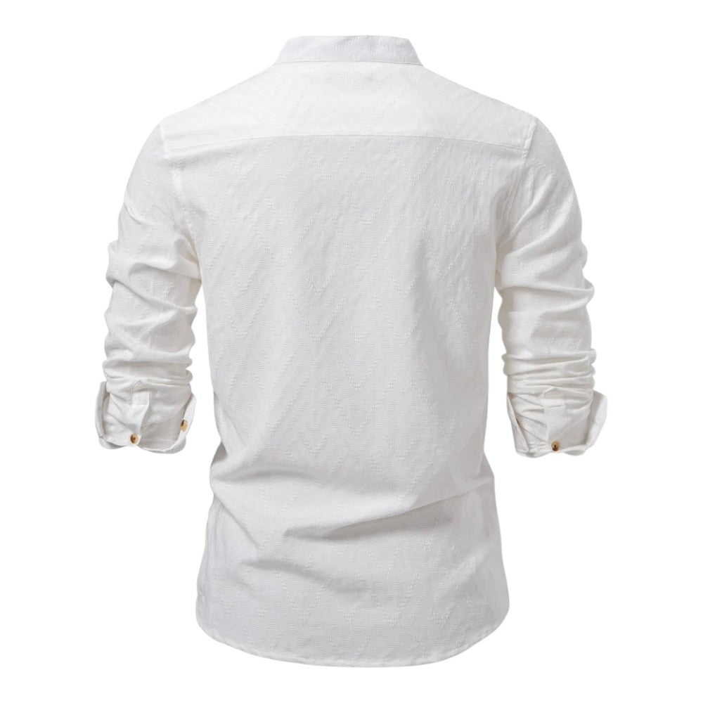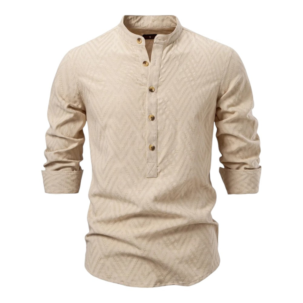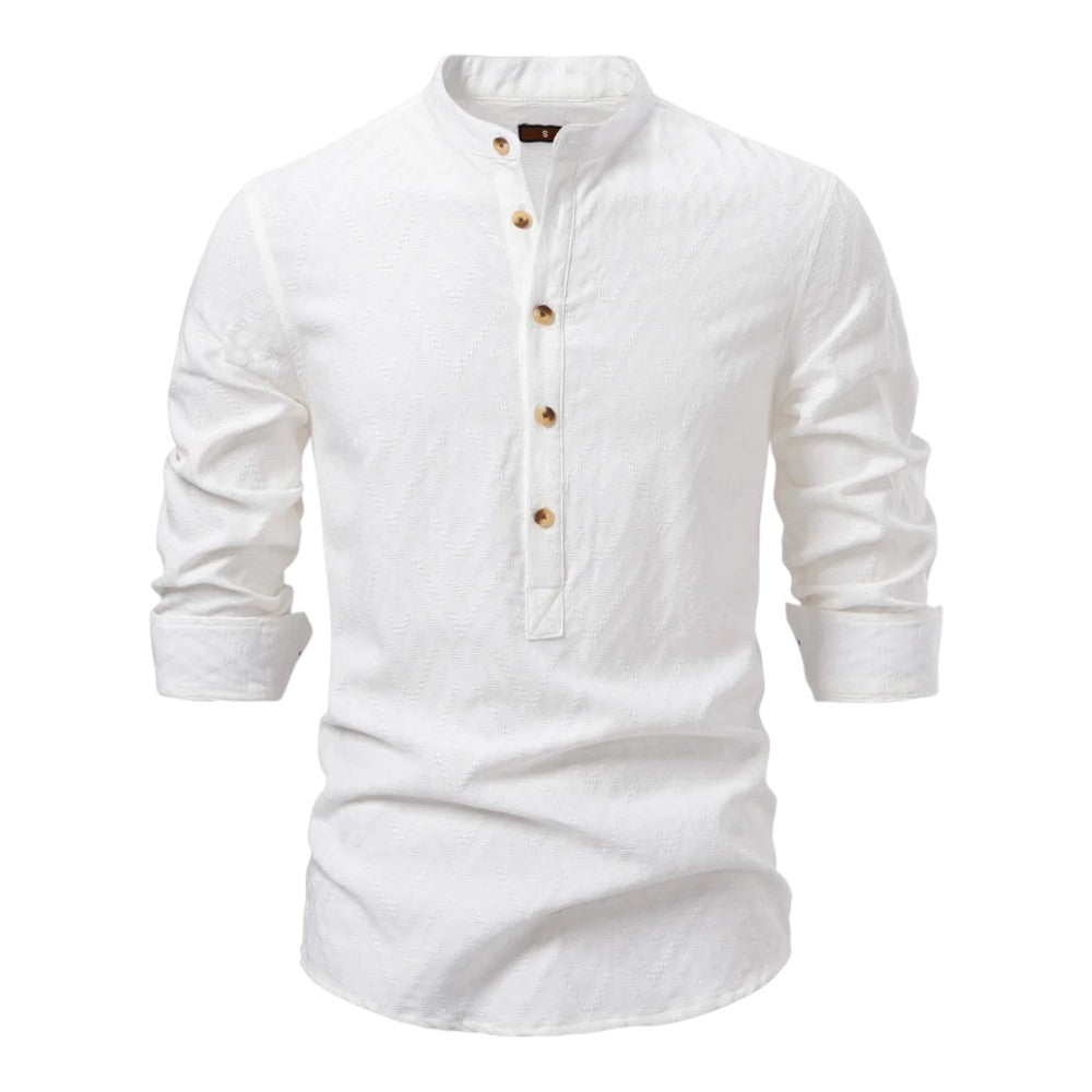 A fresh alternative to the usual button-up—lightweight, easy, and made for warm days. The half-button placket, band collar, and subtle woven pattern give it personality, while natural-look buttons bring a premium finish.