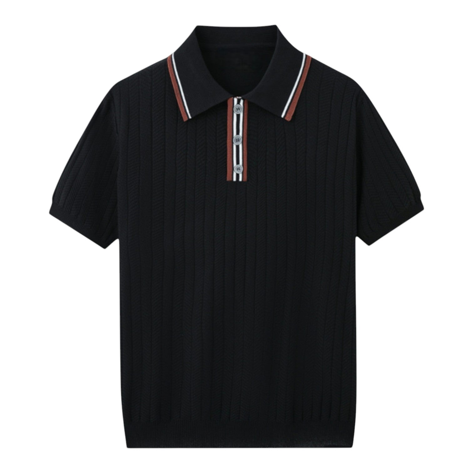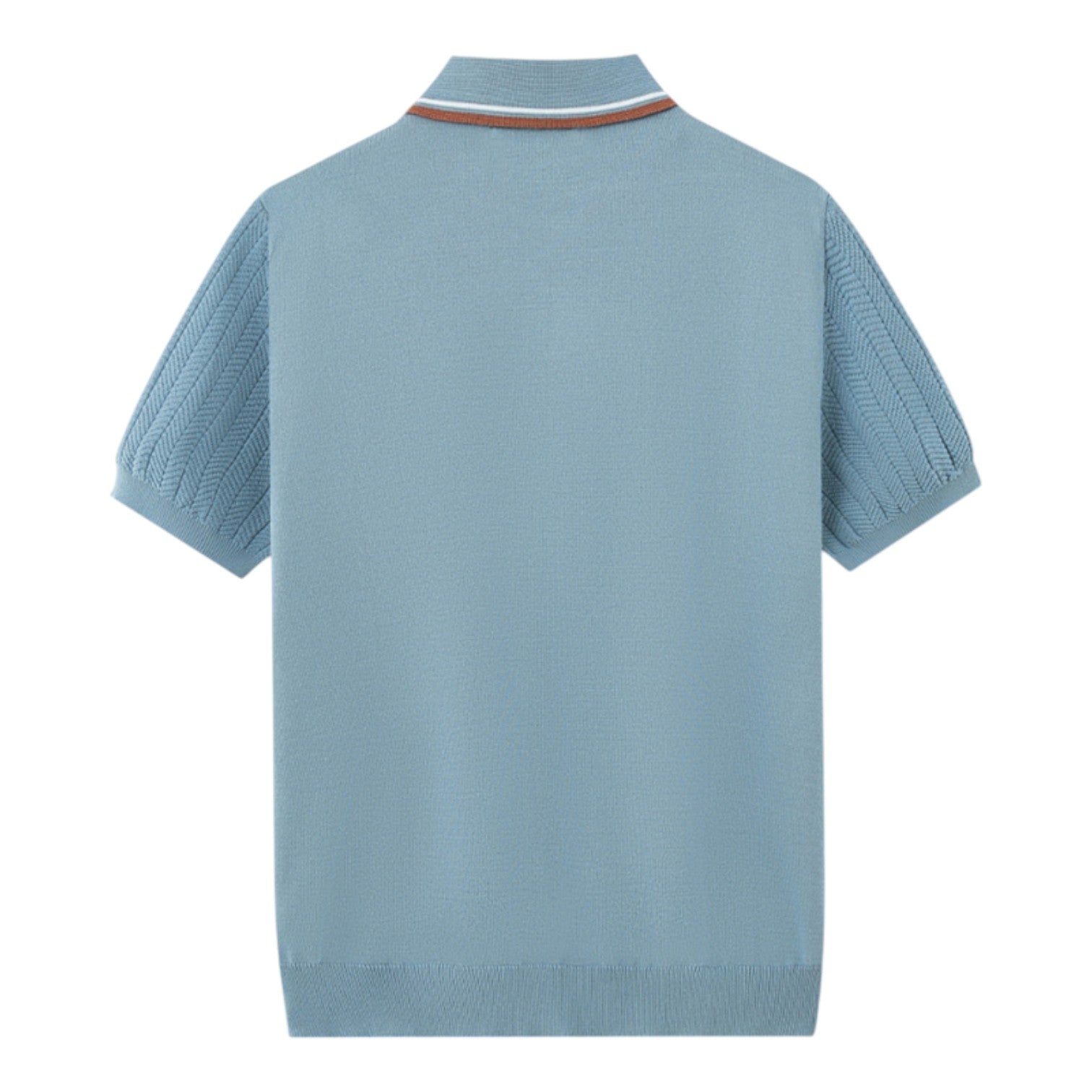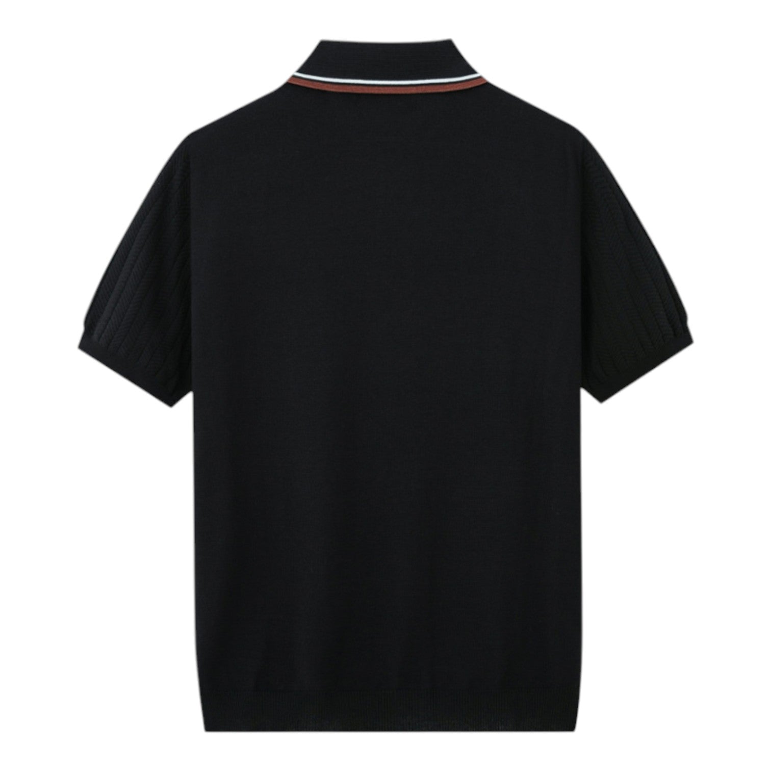 A polished knit polo made from soft viscose with natural stretch. It features a textured knit pattern, contrast collar tipping, and a clean three-button placket — perfect for warm days out, casual evenings, or anything in between.