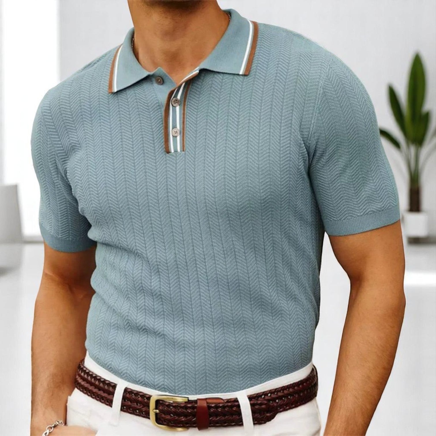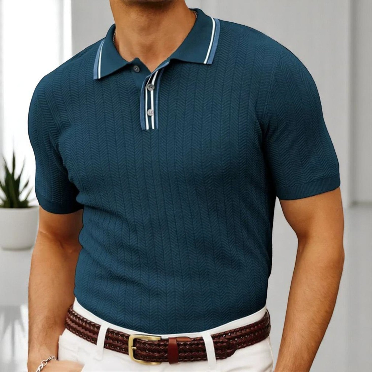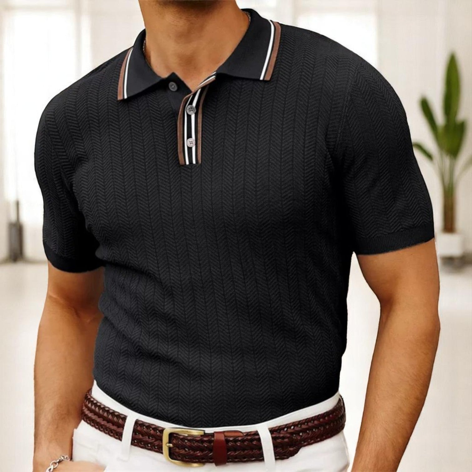 A polished knit polo made from soft viscose with natural stretch. It features a textured knit pattern, contrast collar tipping, and a clean three-button placket — perfect for warm days out, casual evenings, or anything in between.