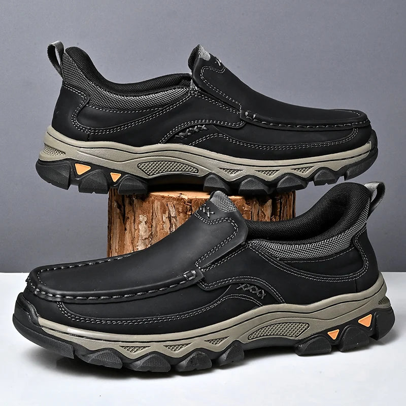 A rugged leather loafer designed for versatility and long-lasting comfort. Crafted from durable split leather with reinforced stitching and a treaded rubber outsole that provides reliable traction and flexibility. The easy slip-on construction keeps the silhouette refined while built to handle everyday wear.